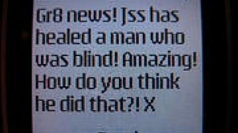 Texts with pictures of IVs and pill bottles and babies under fluorescent lights.